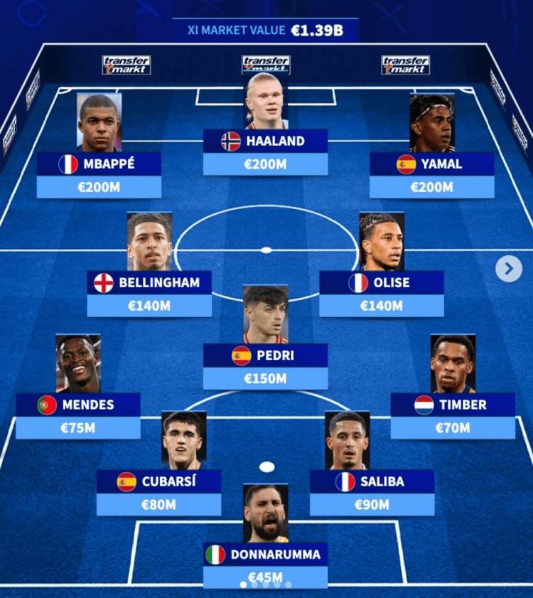 中场:贝林厄姆(英格兰,1.4亿欧)、佩德里(西班牙,1.5亿欧)、奥利塞(法国,1.4亿欧)